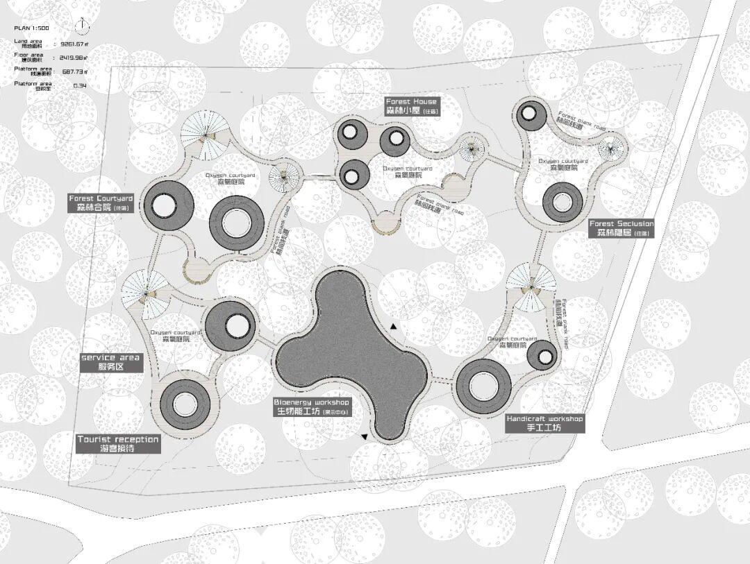 设计拟营造出基于社区建构下的村落式乐园。采用环形空间穿梭于林地中,使用者全方位体验自然的乐趣。