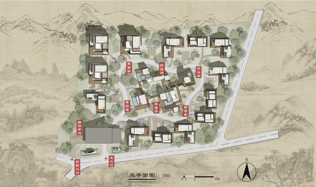 项目取名“山水之间”,灵感来源于传统中国画中的“山”、“水”元素,将“山”元素意化为起伏错落的屋顶,结合丰富的水景以及当地丰富的中医药材资源,共同打造适合中医疗养的世外桃源。