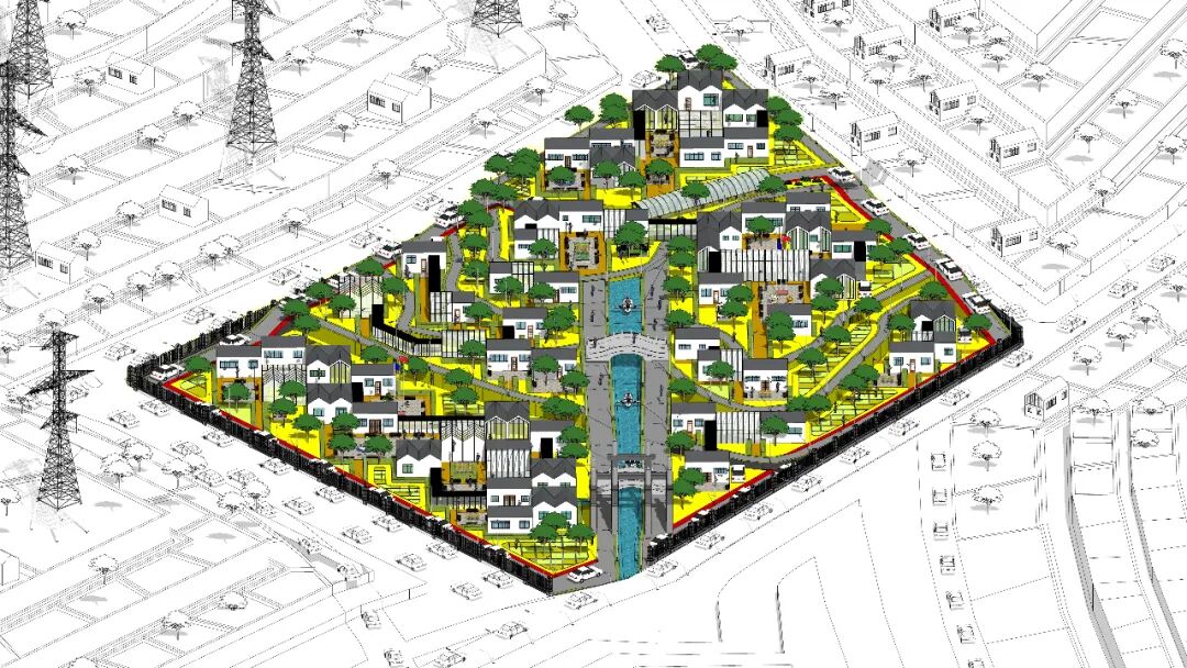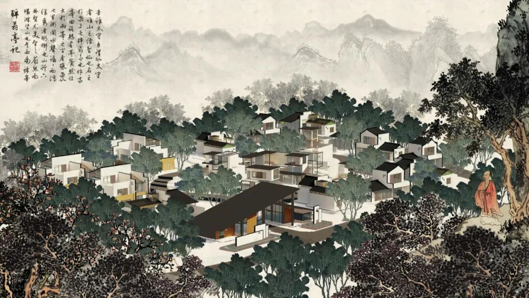 构建山间高低错落、小桥流水人家的乡村肌理。建筑依地势而建,还原田园风貌。融合当地特色产业,加入现代商业元素。