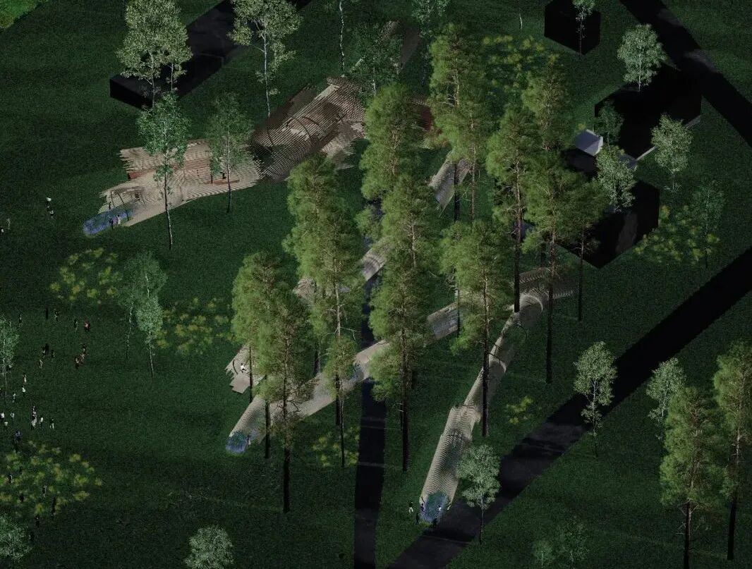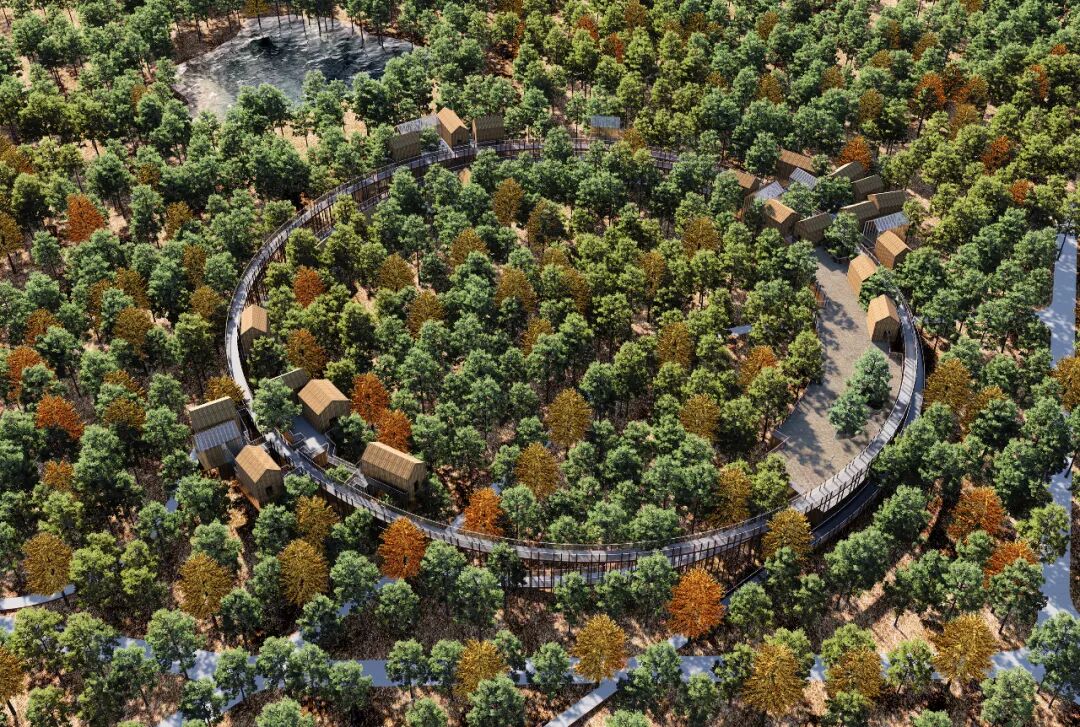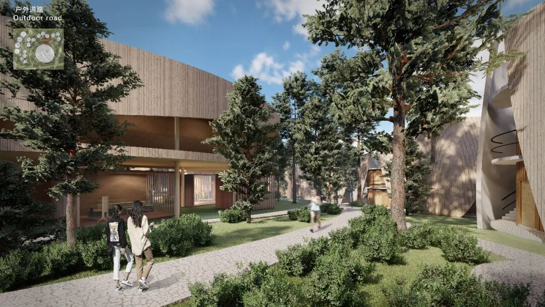 设计拟营造出基于社区建构下的村落式乐园。采用环形空间穿梭于林地中,使用者全方位体验自然的乐趣。