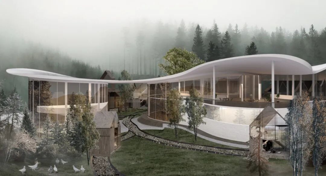 建筑犹如白鹭飞过瑶池飘落的几片羽毛,轻盈且温暖。这是一处“声音疗愈”的康养仙境,将自然声音引入建筑传递于人,使人、建筑与自然三者共生。