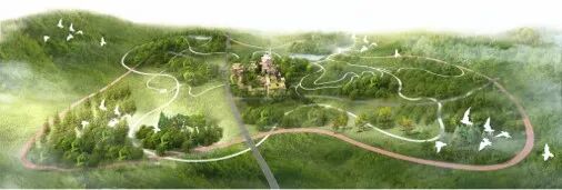 发掘地域特色,用江南水墨描绘乡愁。空中栈道融入山水,轴线贯穿周边肌理,融入健康骑行元素,打造以人为本的商业度假村。